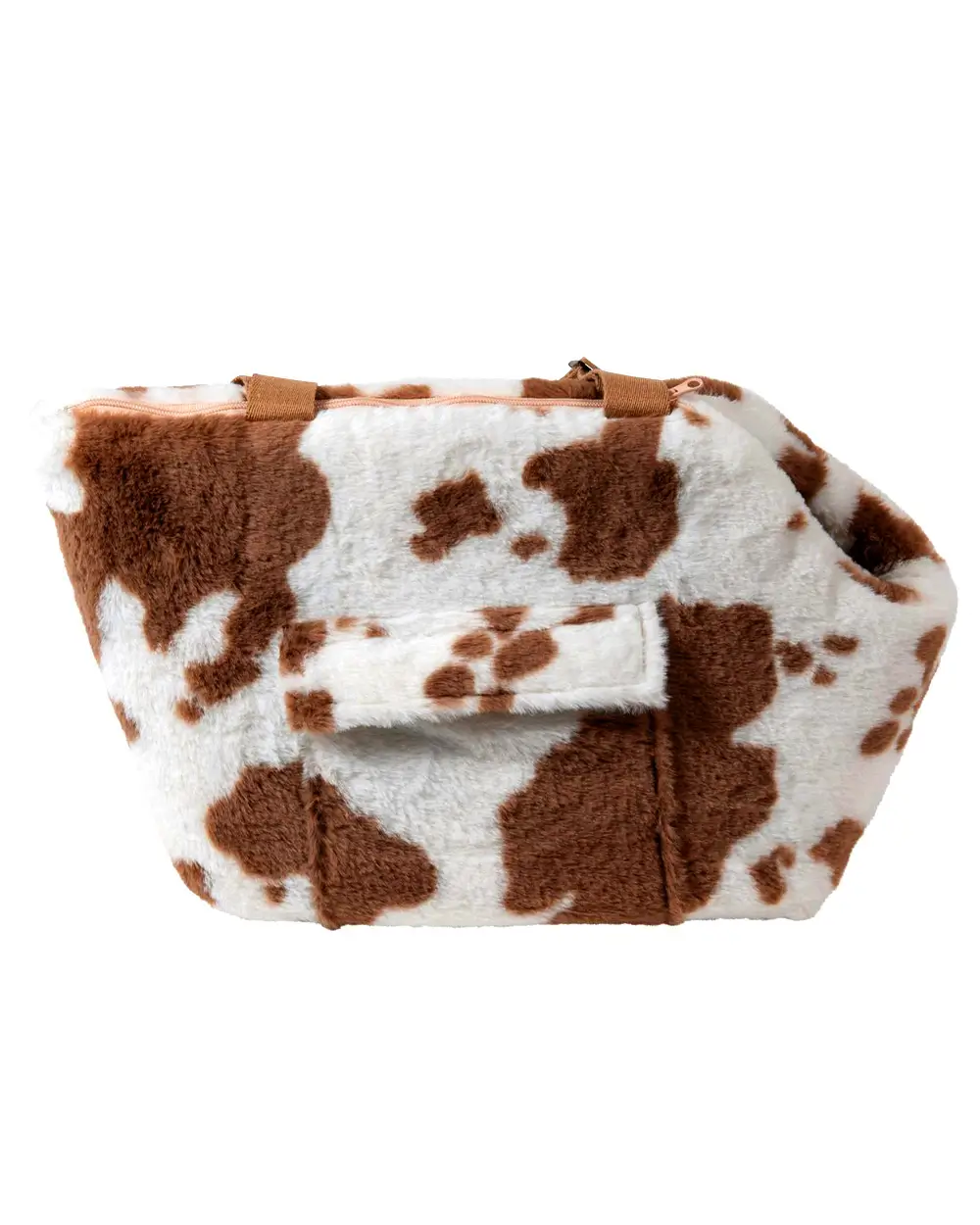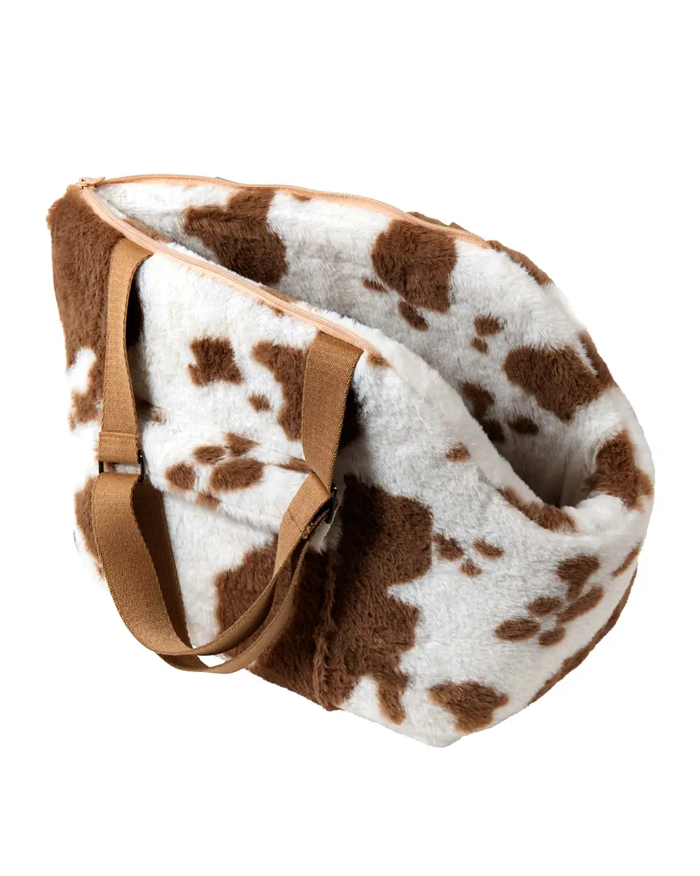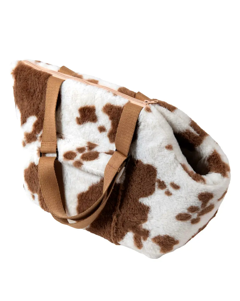 The cow mocha plush pattern gives the carrier a playful designer look. It feels more like a fashion bag than a typical pet carrier.