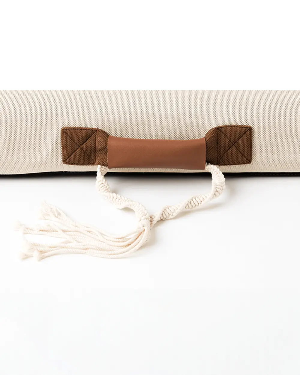 A designer piece that earns its place in the room. Recycled yarn, genuine leather patch, waterproof core — built for real life with a Frenchie in it.