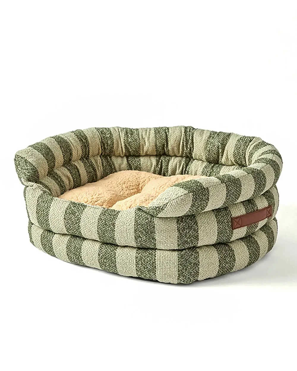 Sage and cream cabana stripes woven into a soft textured bouclé. A rolled bolster edge at two heights — low at the front for easy step-in, tall on the sides for chin-rest support. A cream sherpa sleeping surface in the center. And a saddle leather pull tab on the side that makes it feel like a piece from a design studio rather than a pet aisle.